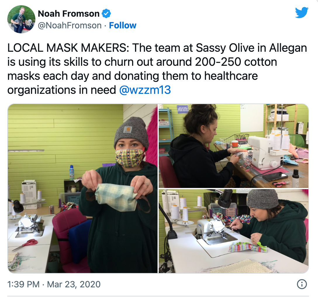 13 on your Side (2020, March 23). Allegan business sewing more than 200 masks a day.
